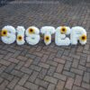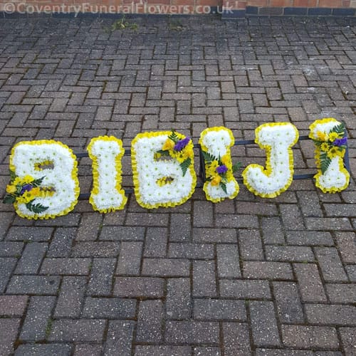 Each letter is based in Double Chrysanths and a Cluster of flowers and Foliage is arranged onto each letter. Finished with a matching ribbon edge.