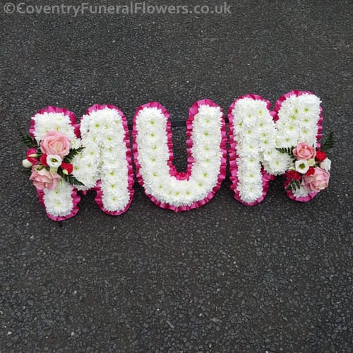 Funeral letters can be spelt in any name. We can make the letters in any colour. Each letter is based in Double Chrysanthemums and is finished with a delicate spray of flowers and foliage. Flower arrangement generally compliments the ribbon at the edge unless otherwise requested.