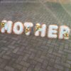 Each letter is based in Double Chrysanths and a Cluster of flowers and Foliage is arranged onto each letter. Finished with a matching ribbon edge.