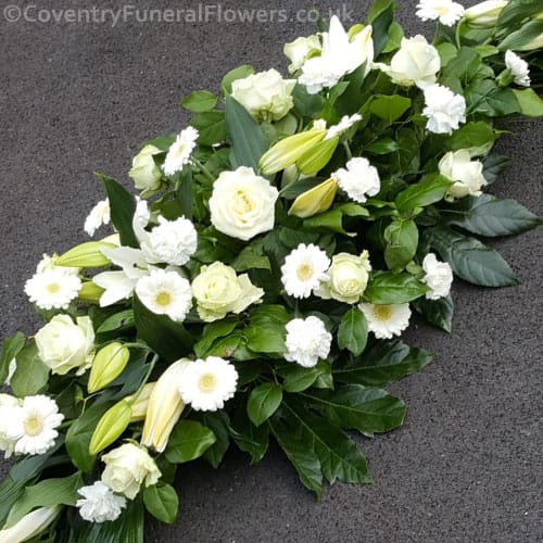 An elegant Casket Spray made with White Lilies, White Roses, White Carnations, White Gerberas and foliage.